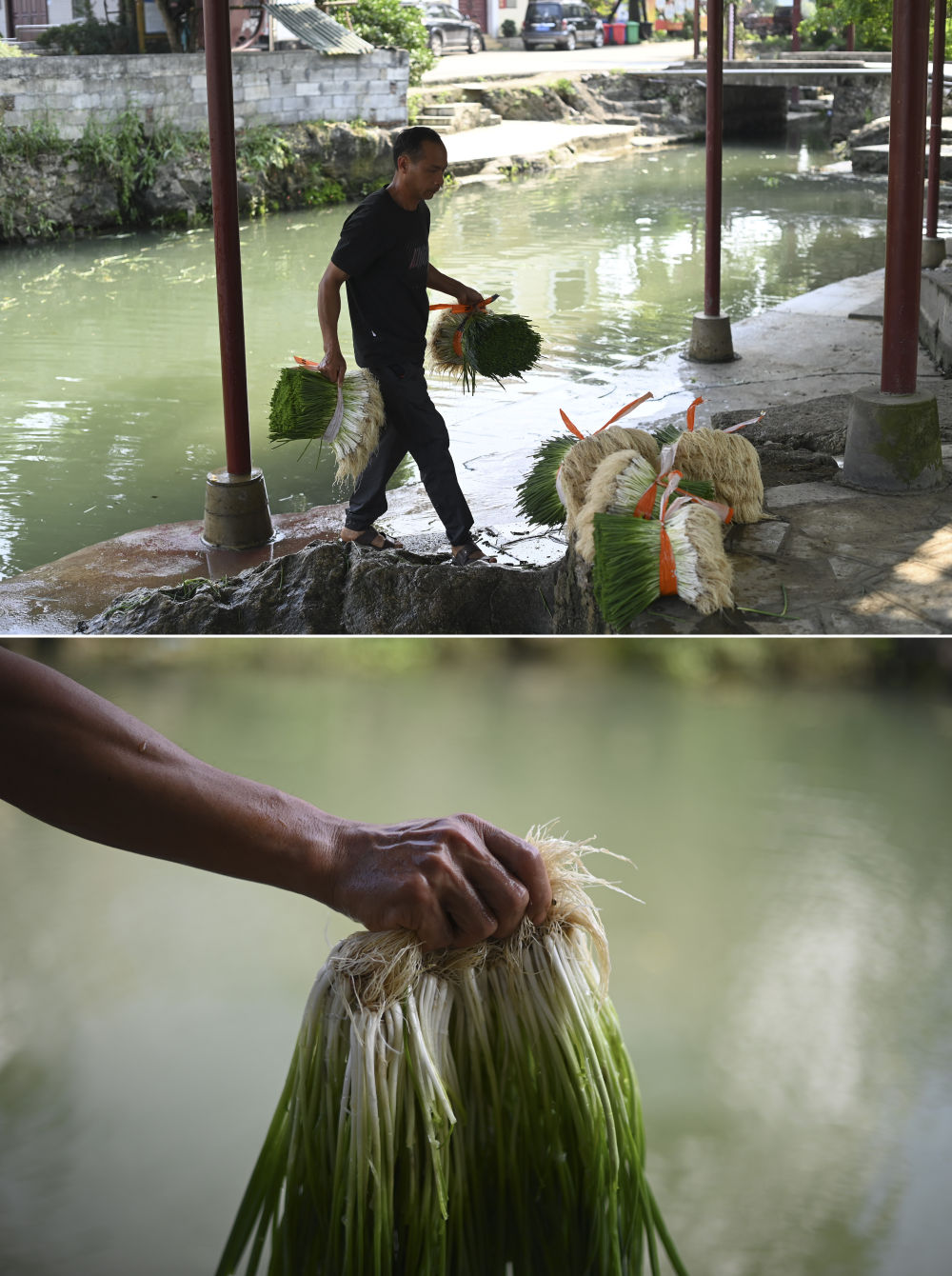 在廣西柳州市柳江區(qū)三都鎮(zhèn)覺(jué)山村,村民韋文中搬運(yùn)香蔥,準(zhǔn)備供應(yīng)市場(chǎng)(4月16日攝)。香蔥種植產(chǎn)業(yè)是覺(jué)山村村民增收致富的支柱產(chǎn)業(yè),韋文中種植10多畝香蔥。