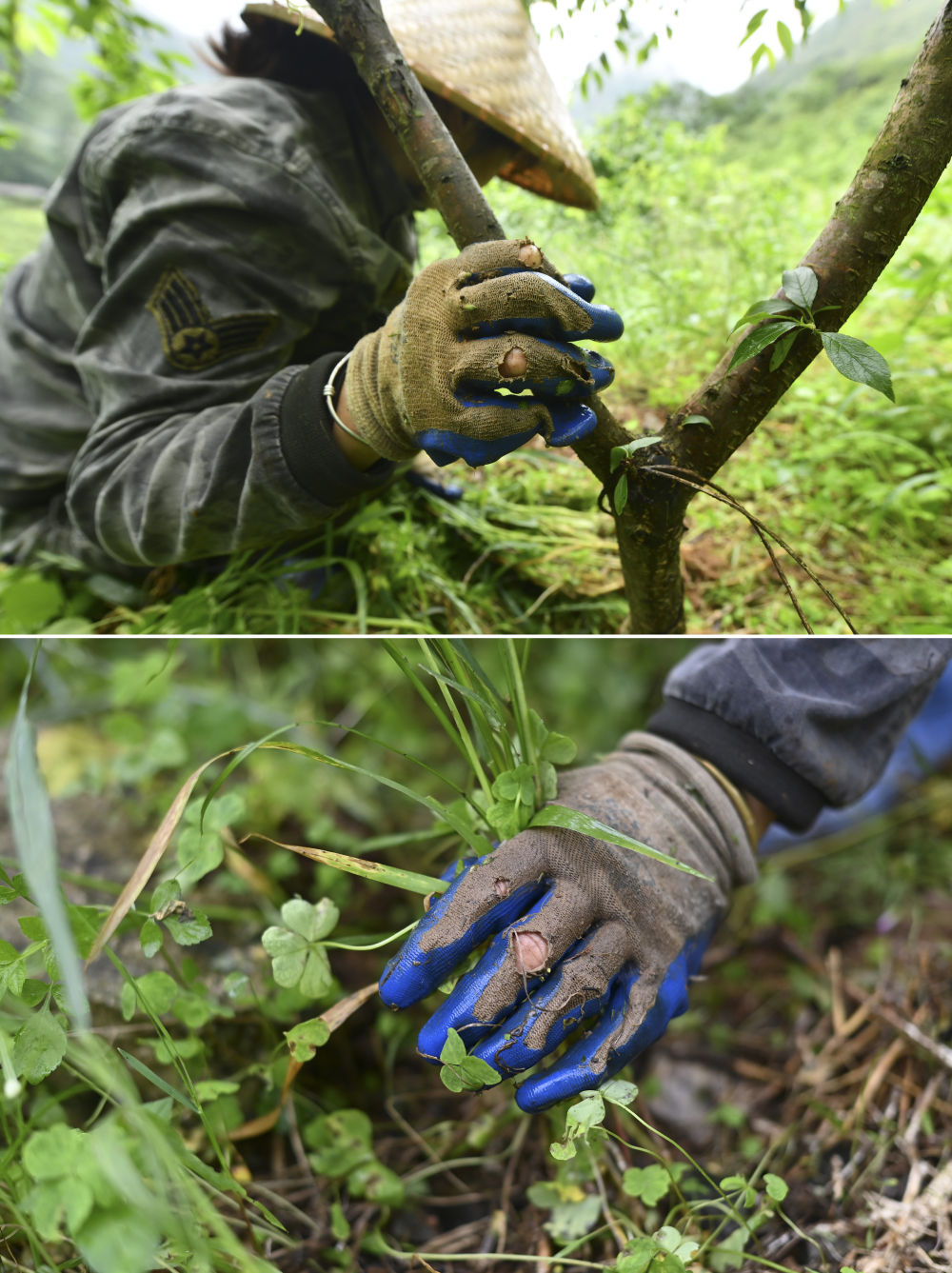 在廣西柳州市融安縣東起鄉(xiāng)銅板屯,村民羅桂枝在山上給果樹除草(4月23日攝)。10多年來(lái),羅桂枝和丈夫返鄉(xiāng)創(chuàng)業(yè),和村民們一起發(fā)展水果種植和觀光旅游。