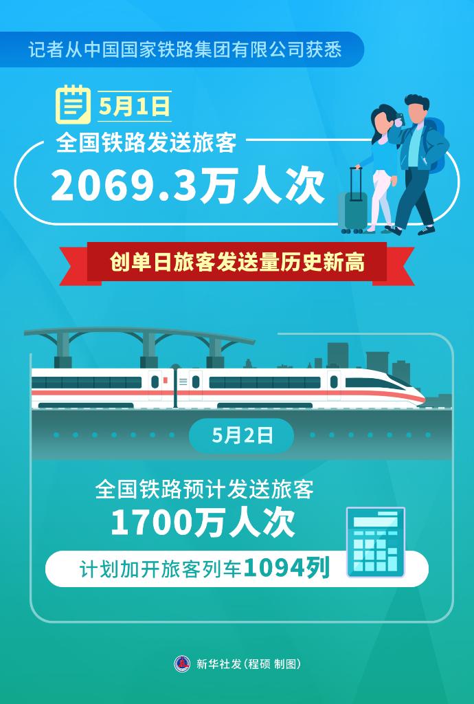 記者從中國國家鐵路集團有限公司獲悉,5月1日,全國鐵路發(fā)送旅客2069.3萬人次,創(chuàng)單日旅客發(fā)送量歷史新高。5月2日,全國鐵路預(yù)計發(fā)送旅客1700萬人次,計劃加開旅客列車1094列。