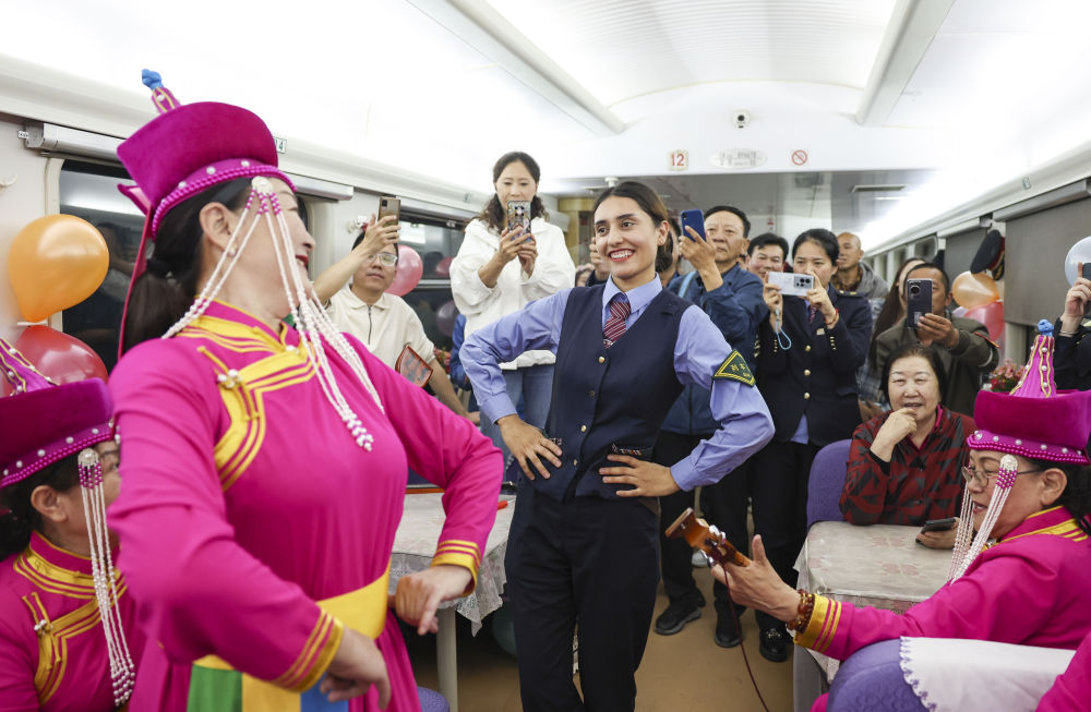 在由喀什開往成都西的列車上,艾爾開牙·多力開與民間藝人一起為乘客跳舞(4月19日攝)。