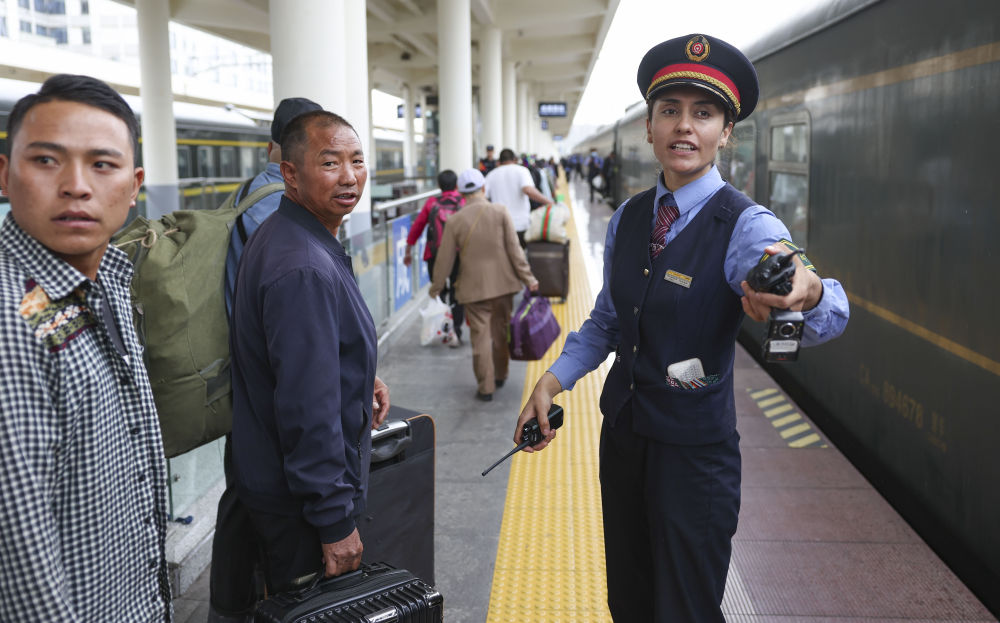 在成都西站,艾爾開牙·多力開(右)引導乘客登上由成都西開往喀什的列車(4月20日攝)。