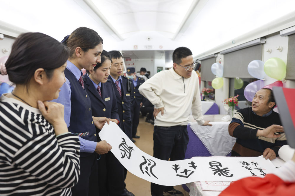一名來自四川樂山的雕刻師(右一)向艾爾開牙·多力開(左二)帶領(lǐng)的乘組贈送書法作品“真水無香”,稱贊乘務員們的辛勤付出(4月19日攝)。