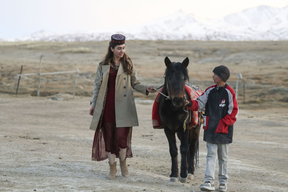 在新疆塔什庫爾干塔吉克自治縣瓦恰鄉(xiāng)夏布孜喀拉村,艾爾開牙·多力開(左)幫母親拎水(2024年3月23日攝)。