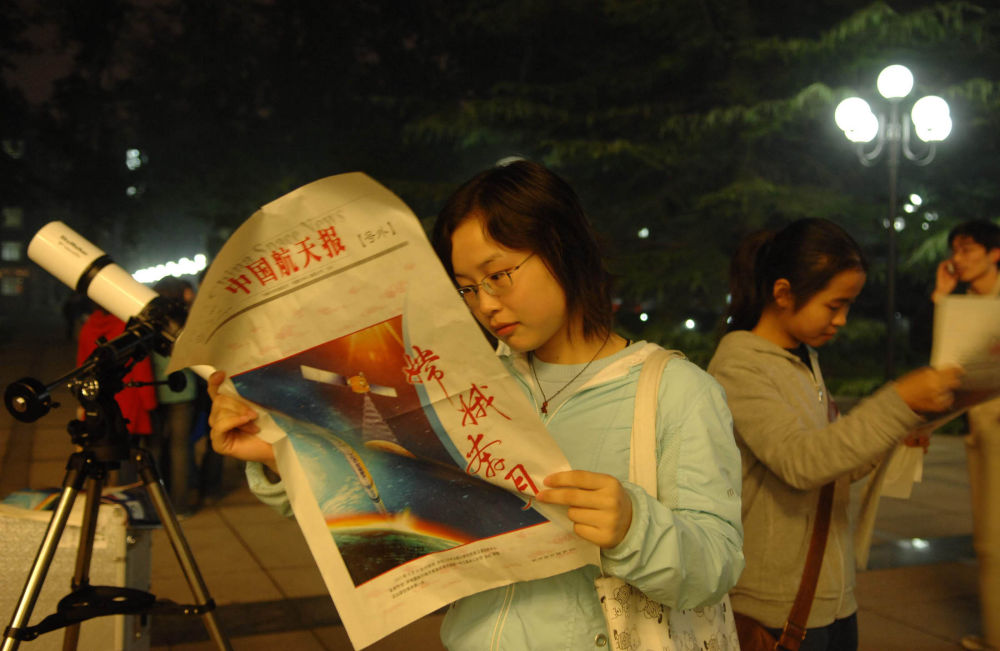 2007年10月24日,北京航空航天大學一名學生在翻看《中國航天報》號外。新華社記者 羅曉光 攝