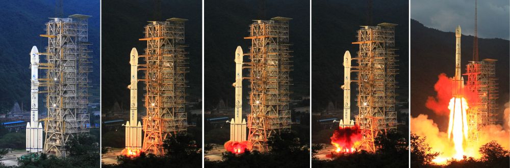 2010年10月1日18時59分57秒,搭載著嫦娥二號衛(wèi)星的長征三號丙運載火箭在西昌衛(wèi)星發(fā)射中心點火發(fā)射。這是嫦娥二號發(fā)射瞬間的情景(拼版照片)。新華社記者 李剛 攝