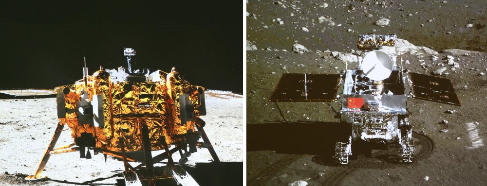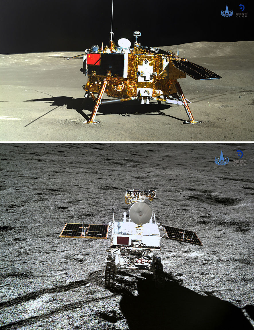 2019年1月11日下午,嫦娥四號著陸器與玉兔二號巡視器工作正常,在“鵲橋”中繼星支持下順利完成互拍(拼版照片)。新華社發(fā)(國家航天局供圖)