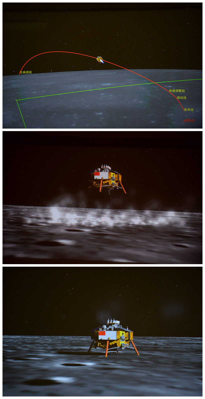 這是2019年1月3日在北京航天飛行控制中心拍攝的降落過程(示意圖)。2019年1月3日10時26分,嫦娥四號探測器自主著陸在月球背面南極-艾特肯盆地內的馮·卡門撞擊坑內,實現(xiàn)人類探測器首次在月球背面軟著陸。新華社記者 金立旺 攝
