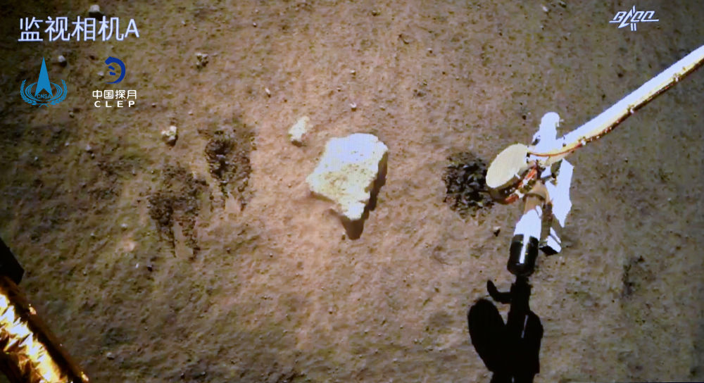 2020年12月2日,嫦娥五號探測器在月球表面自動采樣。新華社發(fā)(國家航天局供圖)