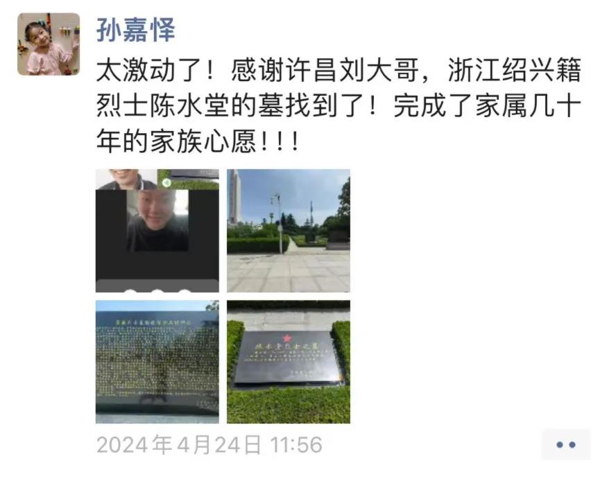 “烈士家屬提供了3張烈士證,姓名、犧牲地點(diǎn)、犧牲時(shí)間全都不一樣?!睂O嘉懌回憶,因?yàn)樾畔?fù)雜,志愿者們一直收集不到褚萃文烈士埋骨地的線索。正當(dāng)她覺得希望渺茫時(shí),突然有人提供了一條信息——中華英烈網(wǎng)名錄中的諸華文,很可能就是大家一直在找的褚萃文。