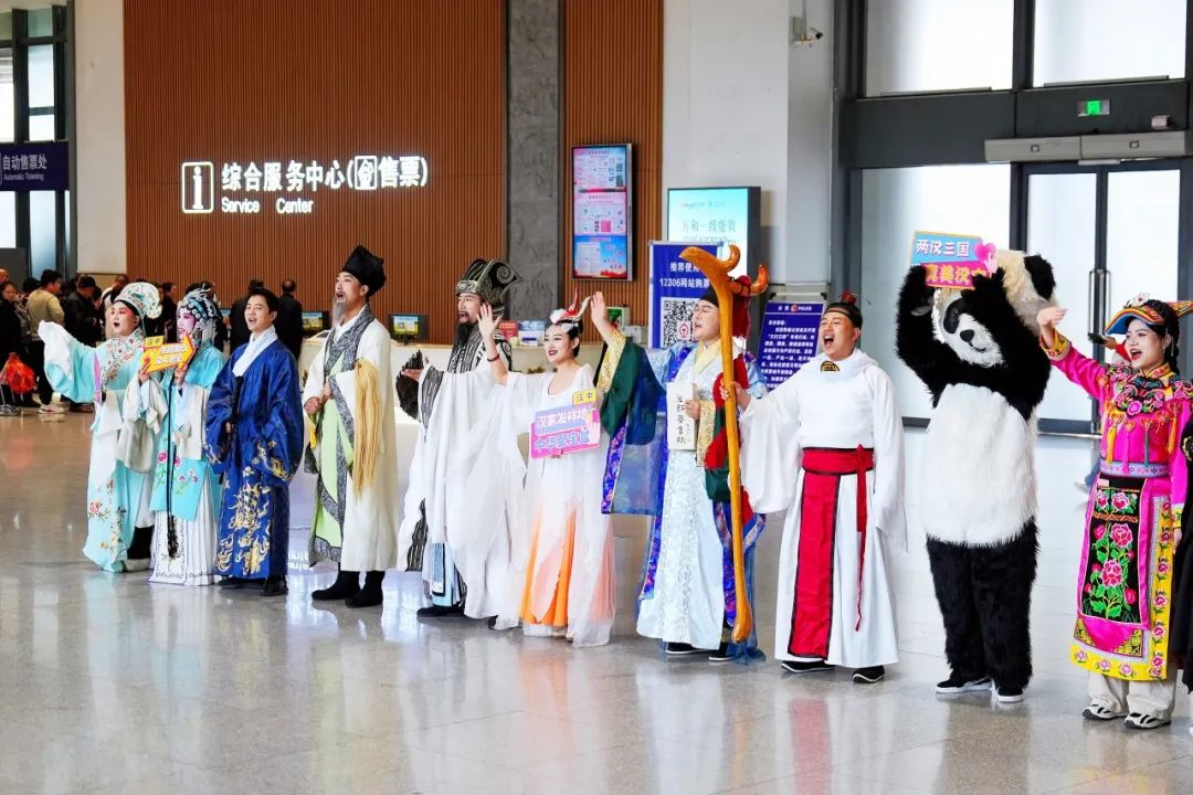 西安局集團(tuán)公司與地方文旅局對(duì)接,組織張騫、劉邦、蔡倫等歷史文化名人及秦嶺四寶人偶、非遺漢調(diào)桄桄戲和羌族服飾演員組成的文旅IP在漢中站開(kāi)展特色迎賓活動(dòng),在互動(dòng)中引導(dǎo)旅客文明出行,展示地域文化。