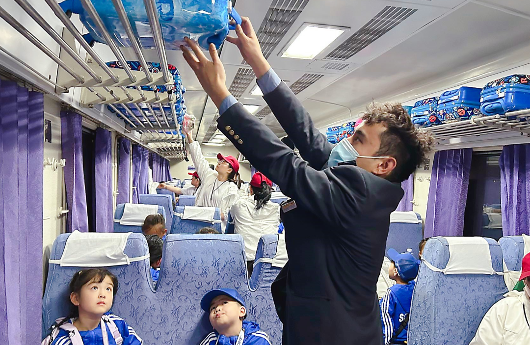 開(kāi)車后,列車長(zhǎng)蔣耀第一時(shí)間和帶隊(duì)老師溝通、了解情況,帶隊(duì)老師說(shuō)他們一共有53名小學(xué)生、8名老師,從吐魯番“研學(xué)”結(jié)束乘坐火車返回庫(kù)爾勒。蔣耀給帶隊(duì)老師講解了兒童乘車安全注意事項(xiàng),又叮囑他們?cè)诼眯衅陂g如遇困難可以找他或乘務(wù)員幫助。