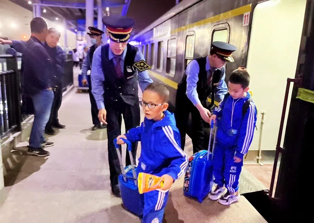 在吐魯番站,一群可愛(ài)的小學(xué)生在老師們的帶領(lǐng)下有序登上7557次列車,列車長(zhǎng)蔣耀和乘務(wù)員西爾扎提·居來(lái)提在11號(hào)車廂門口幫孩子們把藍(lán)色行李箱提上車。