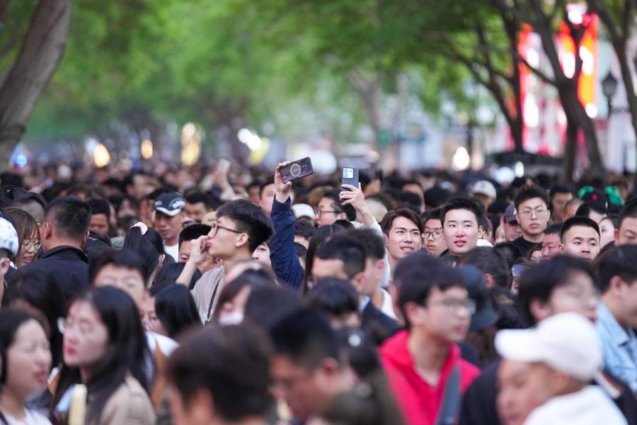 5月1日,哈爾濱中央大街上人頭攢動(dòng)?!拔逡弧奔倨?,文旅市場火熱。新華社記者 王建威 攝