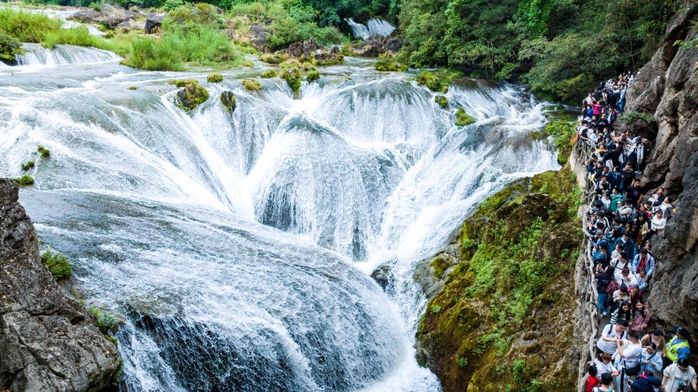 5月2日,游客在貴州省安順市天星橋景區(qū)游覽銀鏈墜潭瀑布(無人機照片)。 新華社發(fā)(陳熙 攝)
