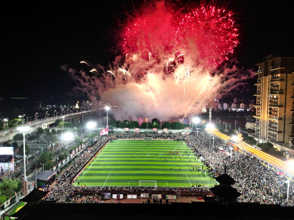 5月4日,游客在貴州省黔東南苗族侗族自治州榕江縣“村超”球場比賽結束后欣賞焰火表演(無人機照片)。新華社發(fā)(王炳真 攝)