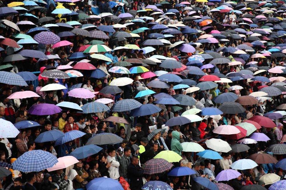 5月1日,人們在貴州省黔東南苗族侗族自治州臺江縣臺盤鄉(xiāng)臺盤村觀看“村BA”球王爭霸賽。新華社發(fā)(余天英 攝)