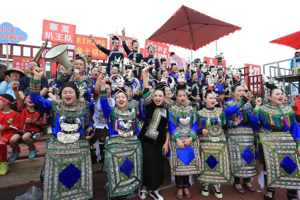 5月4日,在貴州省黔東南苗族侗族自治州榕江縣“村超”球場,身著盛裝的拉拉隊在為本村球隊加油鼓勁。新華社發(fā)(楊成利 攝)