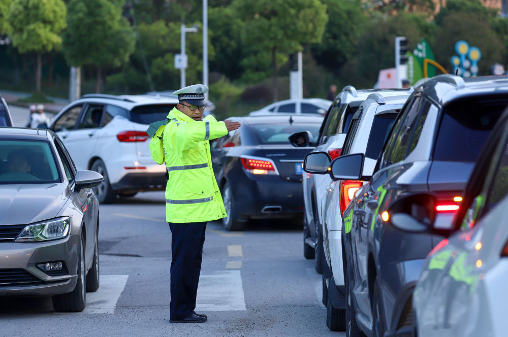 5月4日,民警在貴州省黔東南苗族侗族自治州丹寨縣萬達小鎮(zhèn)為游客指揮交通。新華社發(fā)(陸德華 攝)
