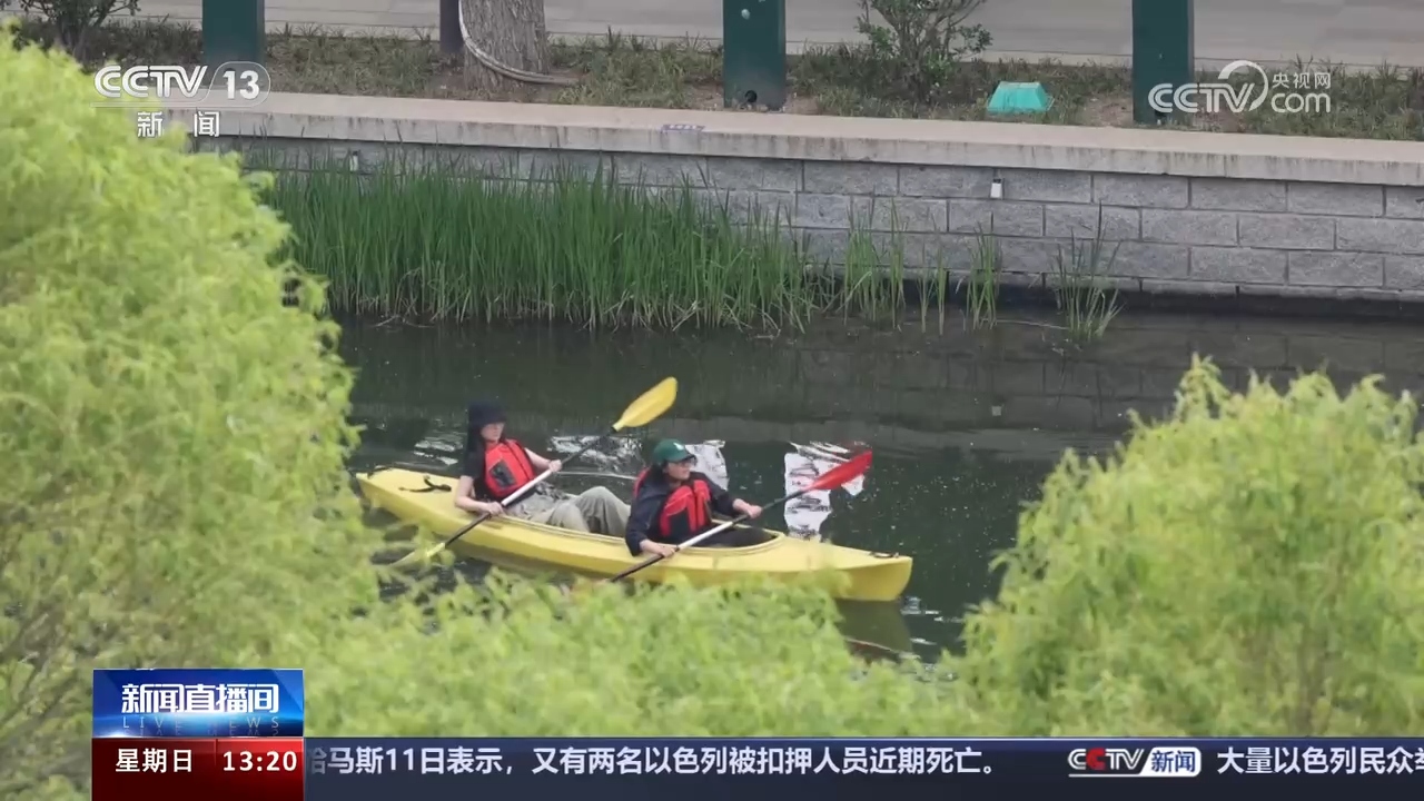 在北京朝陽(yáng)區(qū)亮馬河畔水清岸綠,垂釣、散步、劃槳板的游人絡(luò)繹不絕,享受假日時(shí)光。