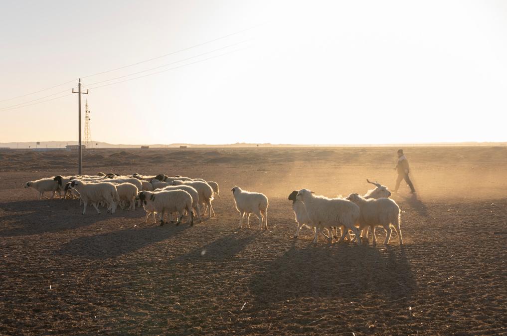 在內(nèi)蒙古阿拉善左旗烏力吉蘇木溫都爾毛道嘎查,牧民朝勒門格爾勒在晨光中放羊(2023年11月17日攝)。新華社記者 才揚 攝