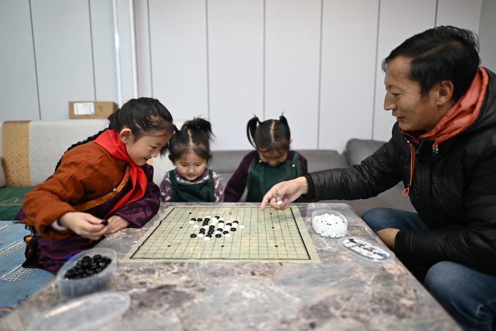青海玉樹曲麻萊縣第二民族完全小學(xué)學(xué)生達沙旦增德金(左一)在家中和爸爸一起下五子棋(2024年1月12日攝)。新華社記者 張宏祥 攝