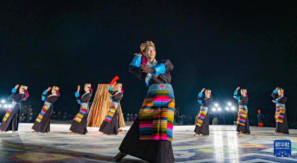 舞蹈演員在納木錯(cuò)開湖篝火晚會(huì)現(xiàn)場(chǎng)表演(5月18日攝)。