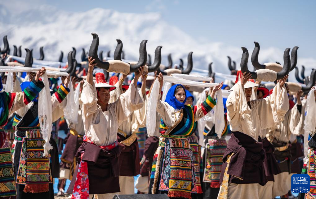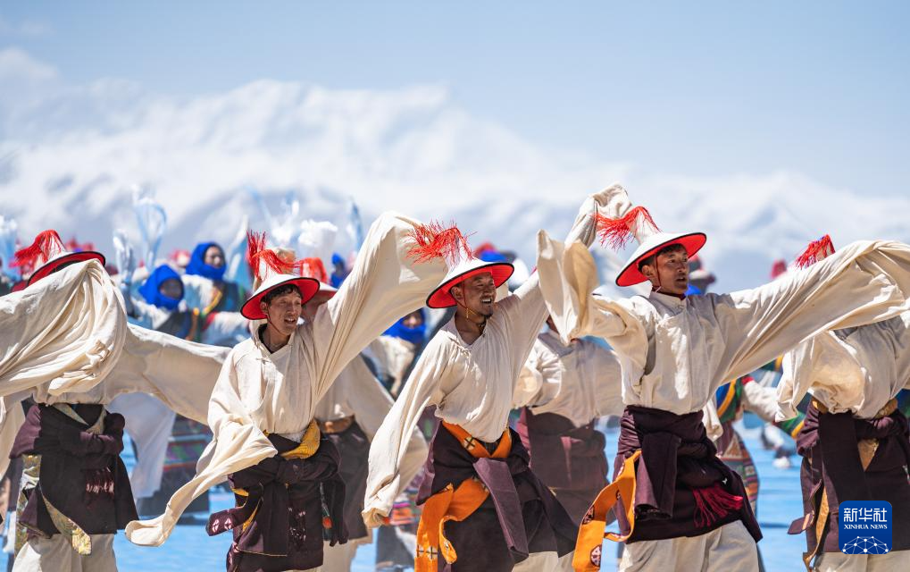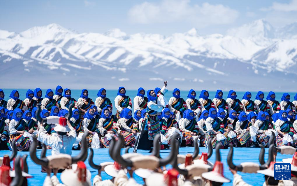 舞蹈演員在納木錯(cuò)開湖活動(dòng)現(xiàn)場(chǎng)表演(5月19日攝)。