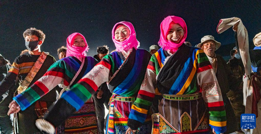 當(dāng)?shù)厝罕娫诩{木錯(cuò)開湖篝火晚會(huì)現(xiàn)場(chǎng)跳鍋莊(5月18日攝)。