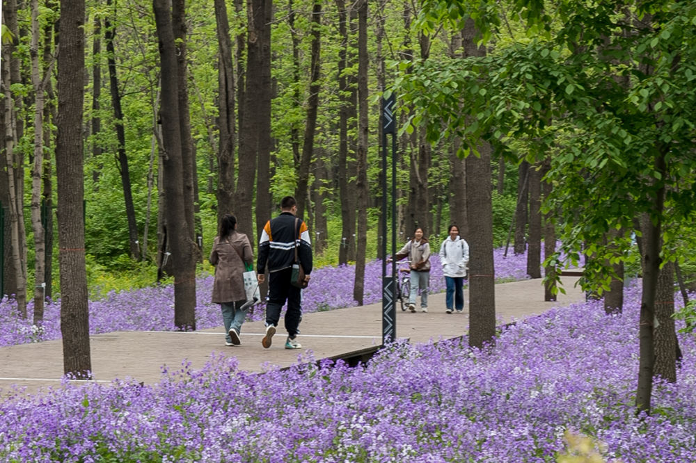 市民、學(xué)生在東北林業(yè)大學(xué)城市林業(yè)示范基地內(nèi)散步(5月11日攝)。(李俊達 攝)