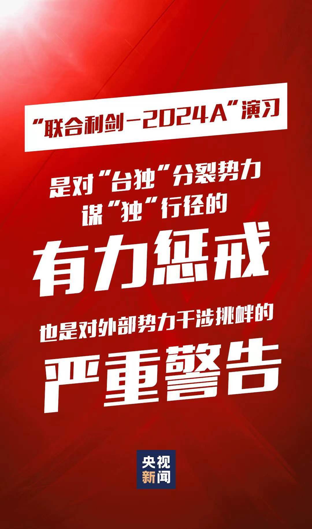 5月23日至24日,中國人民解放軍東部戰(zhàn)區(qū)組織戰(zhàn)區(qū)陸軍、海軍、空軍、火箭軍等兵力,位臺(tái)島周邊開展“聯(lián)合利劍-2024A”演習(xí),重點(diǎn)演練聯(lián)合海空戰(zhàn)備警巡、聯(lián)合奪取戰(zhàn)場綜合控制權(quán)、聯(lián)合精打要害目標(biāo)等科目,艦機(jī)抵近臺(tái)島周邊戰(zhàn)巡,島鏈內(nèi)外一體聯(lián)動(dòng),檢驗(yàn)戰(zhàn)區(qū)部隊(duì)聯(lián)合作戰(zhàn)實(shí)戰(zhàn)能力。這是中國維護(hù)國家主權(quán)和領(lǐng)土完整的正義之舉,也是對(duì)“臺(tái)獨(dú)”分裂勢力謀“獨(dú)”行徑的有力懲戒,對(duì)外部勢力干涉挑釁的嚴(yán)重警告。