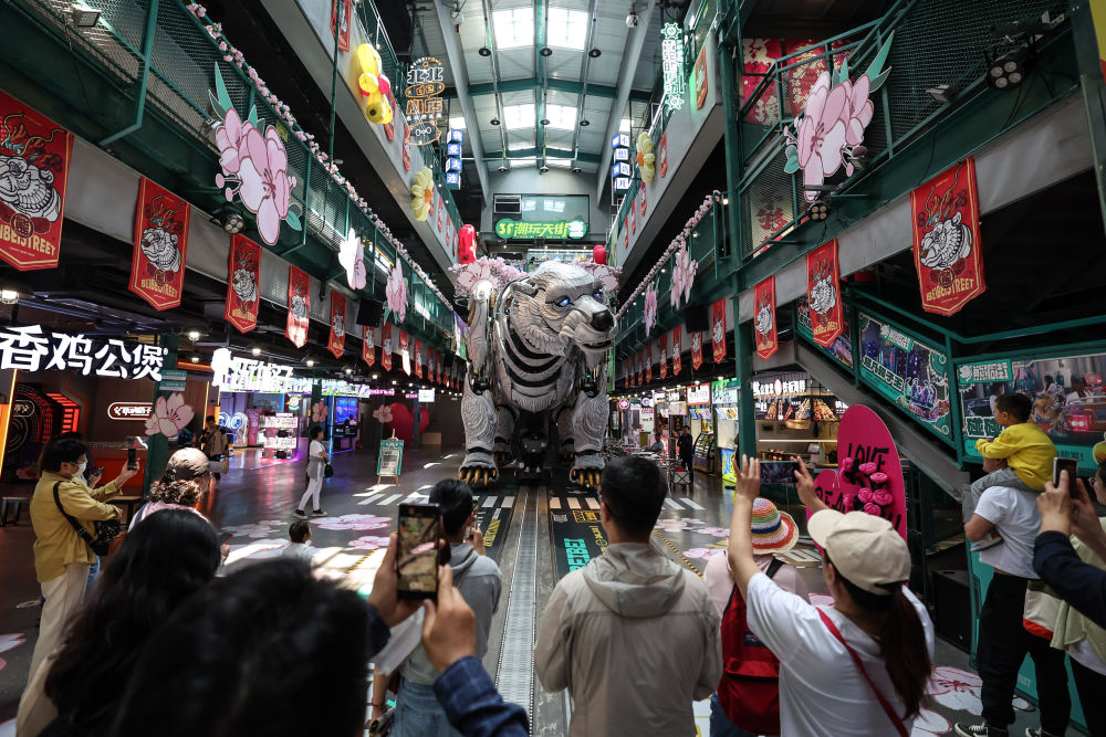 大連熊洞街,當(dāng)身高6米、重達(dá)25噸,灰色的仿生機(jī)械巨熊時(shí)而張口咆哮,時(shí)而緩緩前行,游客爆發(fā)出陣陣歡呼。大連冰山慧谷發(fā)展有限公司總經(jīng)理助理藍(lán)費(fèi)靜說:“這一街區(qū)由擁有近百年歷史的大連冰山集團(tuán)舊址改造而來,現(xiàn)已匯聚上百家游樂、電玩、研學(xué)商戶,老廠房煥發(fā)了新生機(jī)?!?/p>