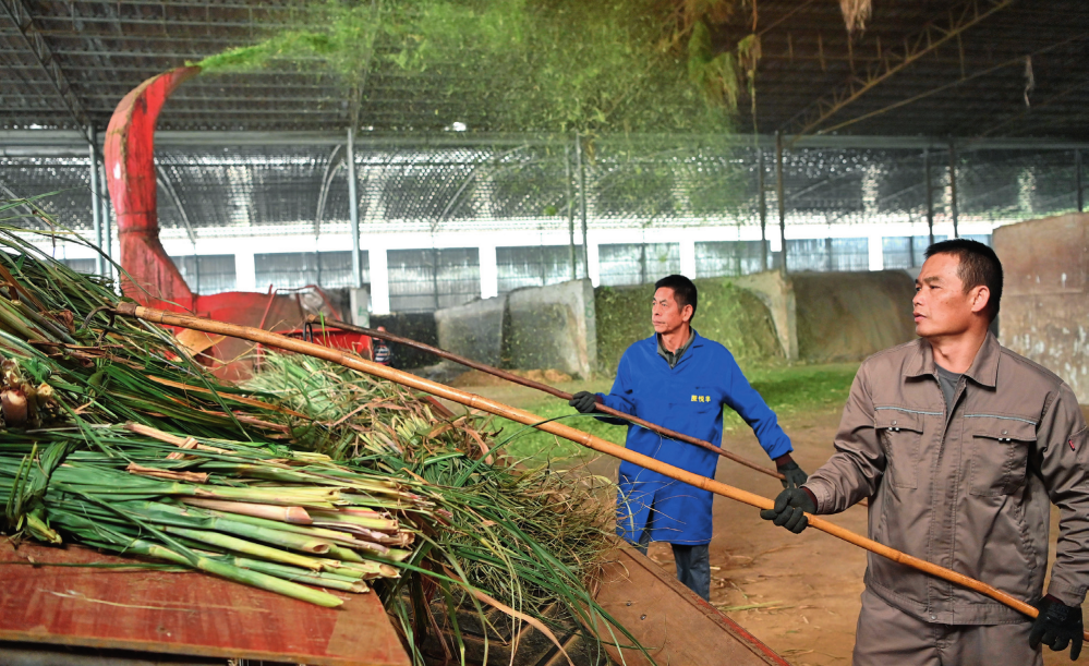 工作人員在廣西來賓市興賓區(qū)大灣鎮(zhèn)雙誠牧業(yè)有限公司粉碎甘蔗尾葉,準(zhǔn)備制作牛飼料(2023年12月13日攝)周華攝