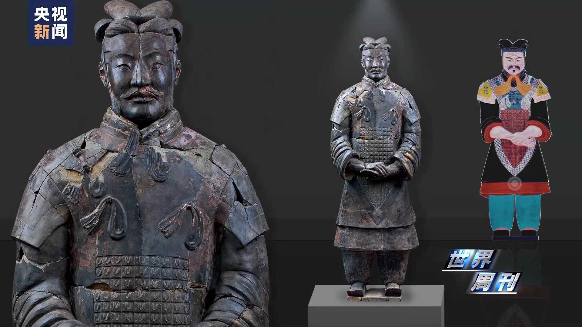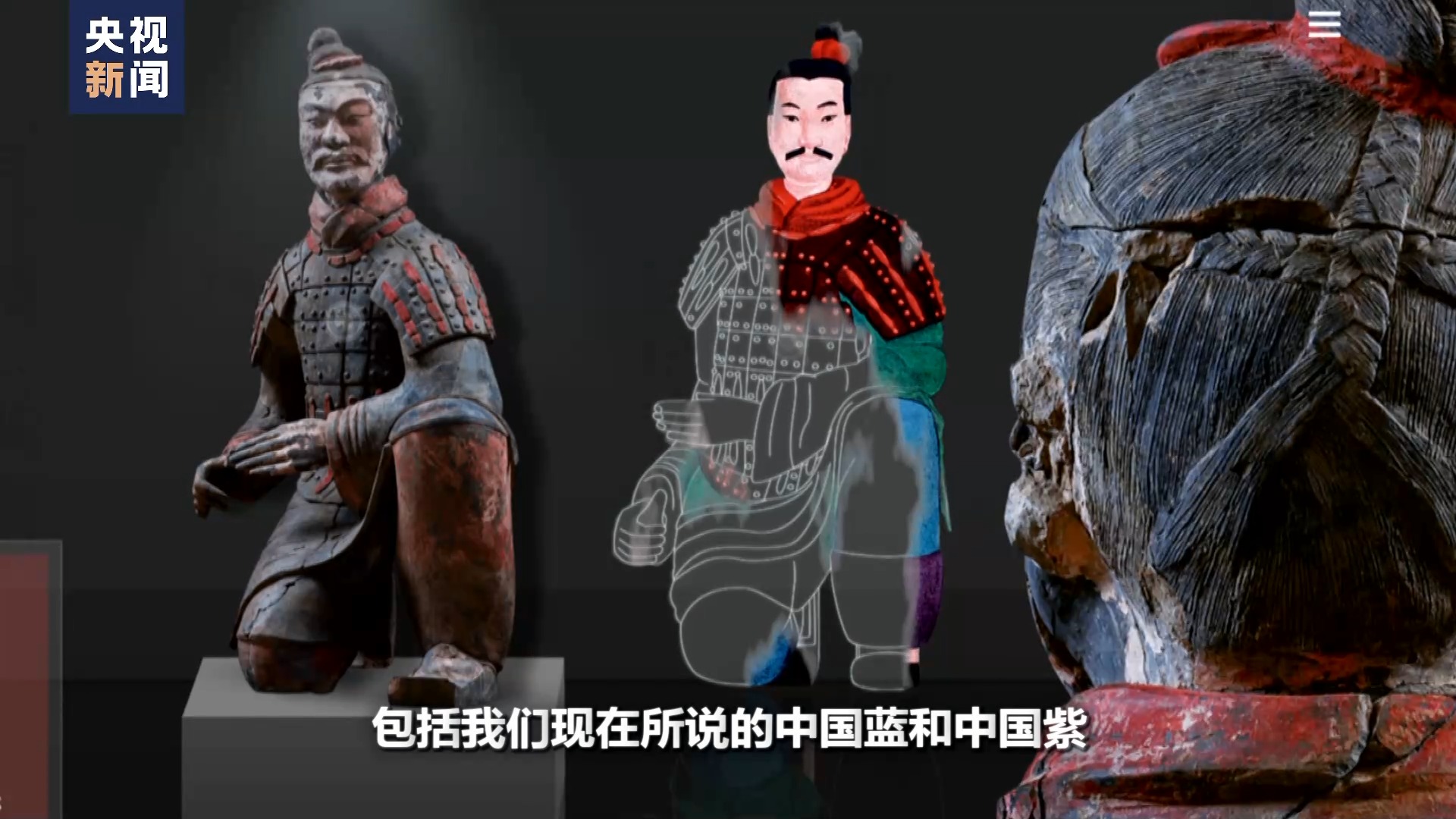 秦始皇帝陵博物院文物保護(hù)修復(fù)專家 蘭德省:那么這在秦俑實(shí)際上,目前有八種顏色。紅、黃、綠、藍(lán)、紫、白、黑、粉等等,這就是已經(jīng)定型的八種。但是我們最近也要分析比這個還要多,包括有一些它是白里透紅的粉色,還有的它就是幾種合成色,包括我們現(xiàn)在所說的中國藍(lán)和中國紫。