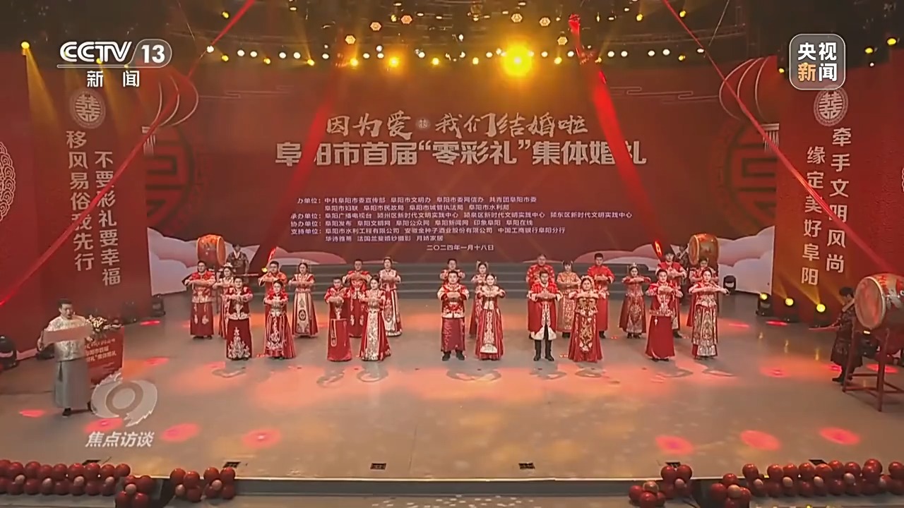不久前,安徽阜陽(yáng)當(dāng)?shù)?0余家媒體共同直播了一場(chǎng)“零彩禮”集體婚禮,58對(duì)新人在親人、觀禮嘉賓及廣大網(wǎng)友祝福聲中,鄭重許下相守一生的承諾。
