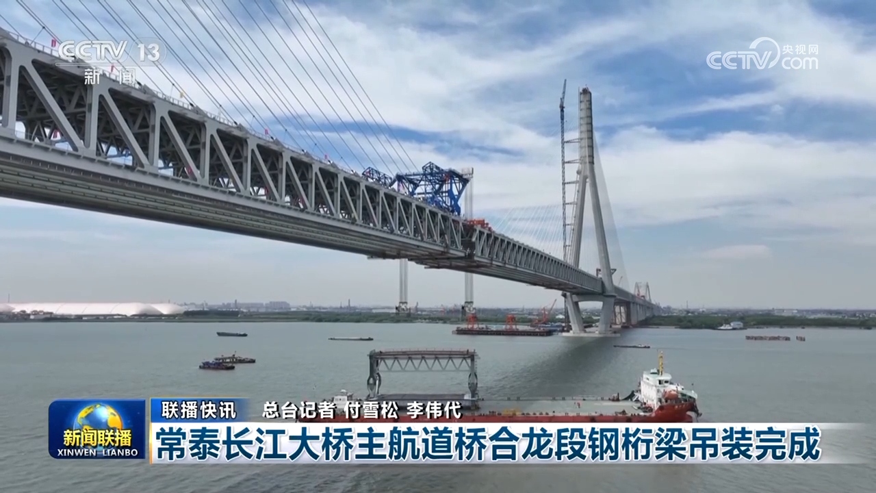 常泰長(zhǎng)江大橋主航道橋合龍段鋼桁梁吊裝完成
