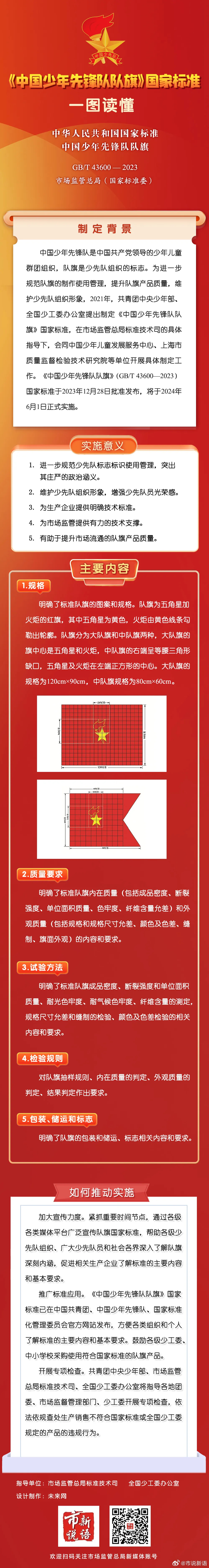 《中國少年先鋒隊隊旗》(GB/T 43600—2023)國家標準將于2024年6月1日正式實施。該標準由市場監(jiān)管總局(國家標準委)批準發(fā)布,共青團中央、全國少工委會同相關(guān)單位編制。