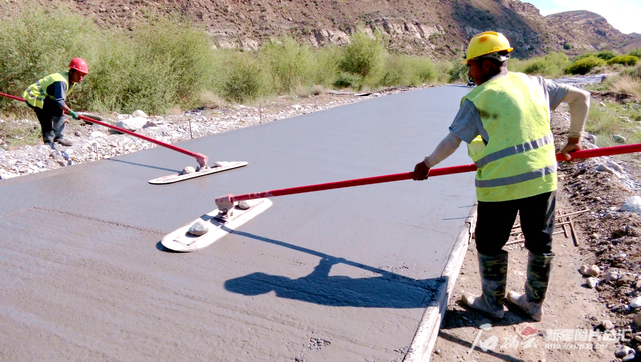 拜城縣鐵熱克鎮(zhèn)農(nóng)村公路建設(shè)現(xiàn)場(chǎng),工人們抹平路基上的混凝土。魏百寧攝
