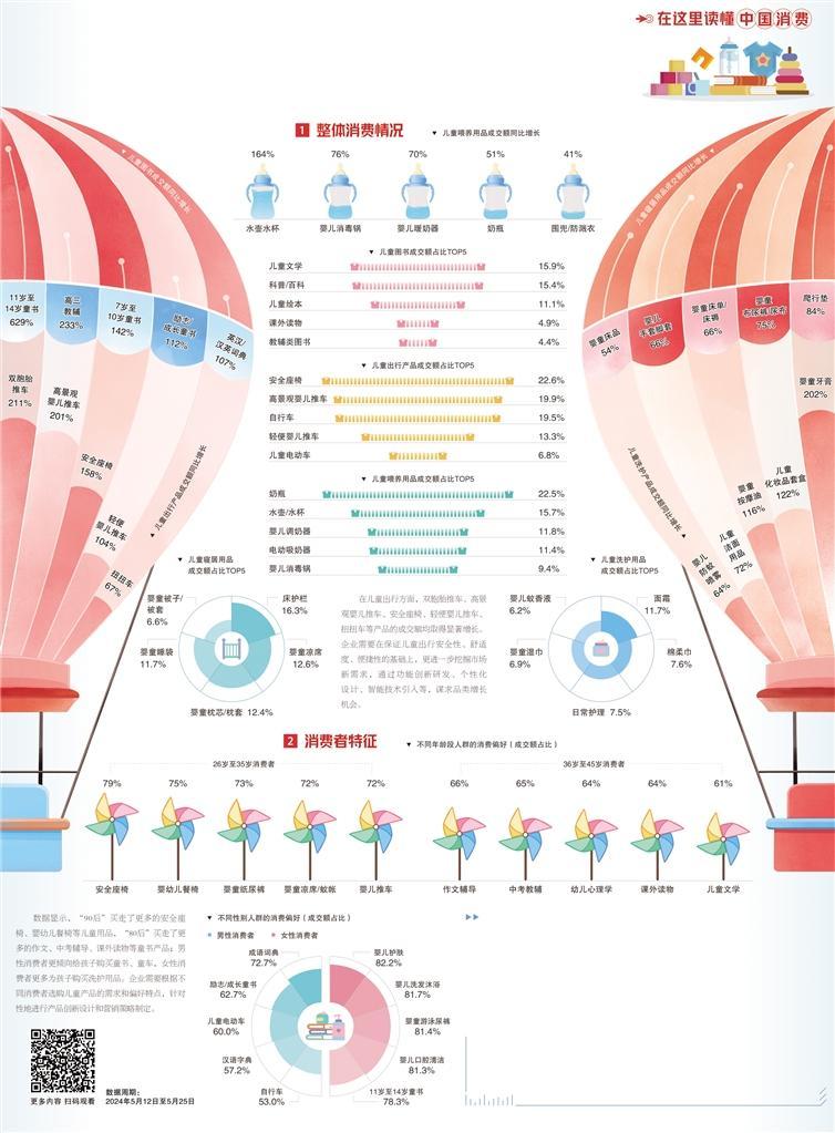 消費(fèi)者精致育兒需求不斷升級,圍繞功能需求細(xì)分、場景消費(fèi)精細(xì)化等維度的兒童用品受到越來越多關(guān)注。在兒童喂養(yǎng)用品消費(fèi)中,水壺水杯、嬰兒消毒鍋、嬰兒暖奶器、奶瓶等成交額同比增長超五成;在兒童洗護(hù)用品消費(fèi)中,嬰童牙膏、嬰童按摩油等產(chǎn)品成交額同比增長超100%。