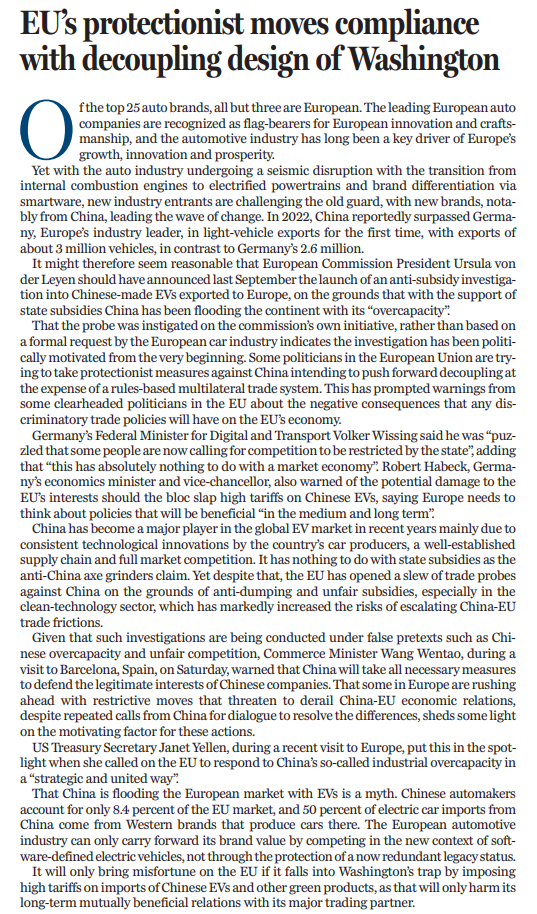 原標題:EU's protectionist moves compliance with decoupling design of Washington