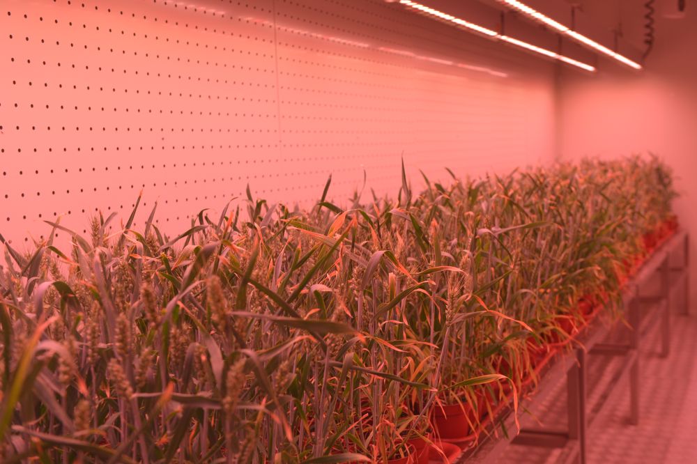 這是5月31日在位于河南新鄉(xiāng)的中原農(nóng)谷國家生物育種產(chǎn)業(yè)創(chuàng)新中心神農(nóng)種業(yè)實(shí)驗(yàn)室人工氣候室內(nèi)拍攝的培養(yǎng)架上的小麥苗。(新華社記者劉力航 攝)