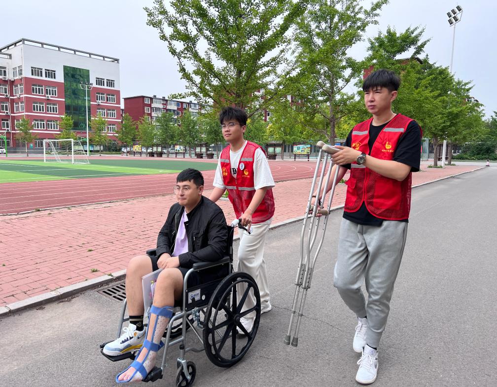 “我腳受傷了,行走不方便,你們能推我進考場嗎?”“沒問題!我們會全程陪你進出考場。”沈陽市第五十三中學(xué)考點門口,當看到一位考生坐著輪椅行動不便時,志愿者們迅速承擔起了接送任務(wù)。