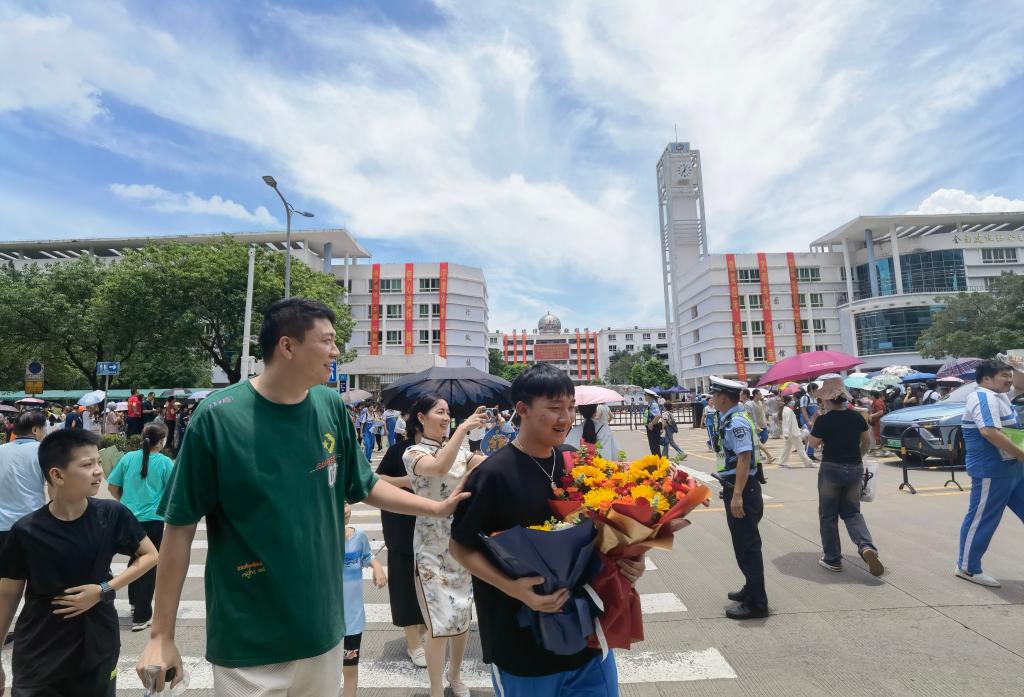 9日下午6點15分,最后一門生物學考完后,廣東2024年高考順利結(jié)束。在廣州市第六中學考場門口,一位父親手持親手做的向日葵迎接兒子,表達“一舉奪魁、金榜題名”的美好愿望;一位母親對兒子說,不管考得如何,接下來是新的開始。
