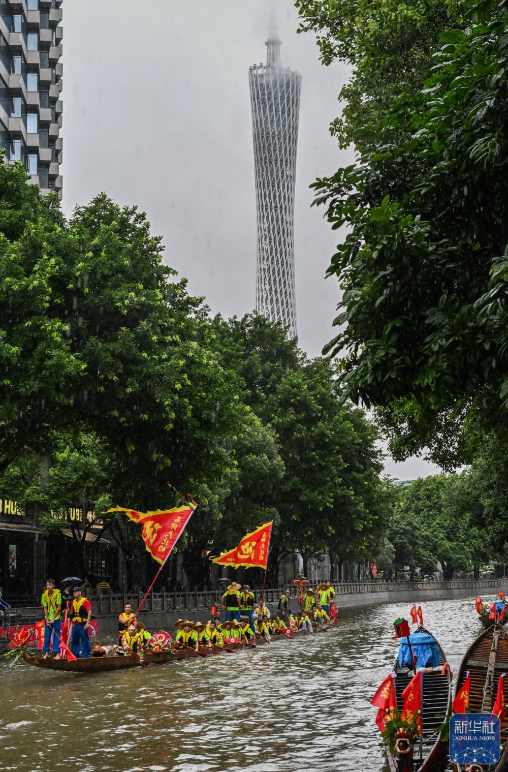 6月10日,獵德村熱鬧的傳統(tǒng)龍舟“龍船景”與繁忙的現(xiàn)代都市交匯相融(無人機(jī)照片)?!褒埓啊笔菑V府地區(qū)水鄉(xiāng)在端午期間舉辦的一種民俗活動(dòng)。新華社記者 劉大偉 攝