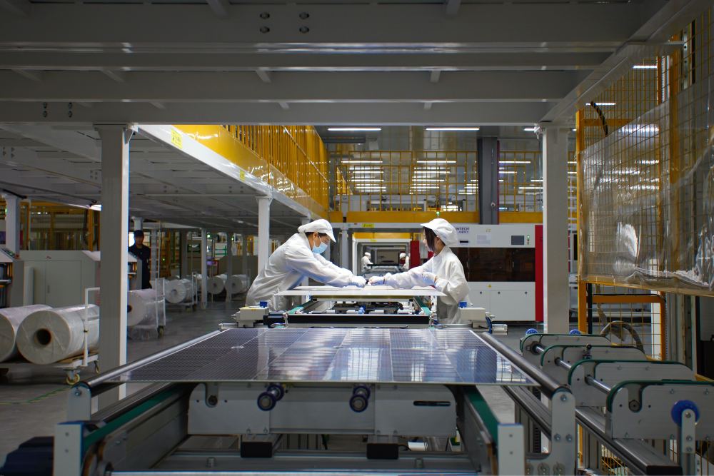在安徽省滁州市鳳陽縣一家光伏企業(yè)內(nèi),工人在生產(chǎn)線上忙碌(2023年6月14日攝)。