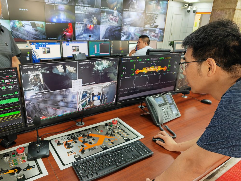 在山西省霍州市的山西焦煤集團(tuán)李雅莊煤礦,綜采隊(duì)技術(shù)員在井上控制井下割煤機(jī)(2024年5月29日攝)。