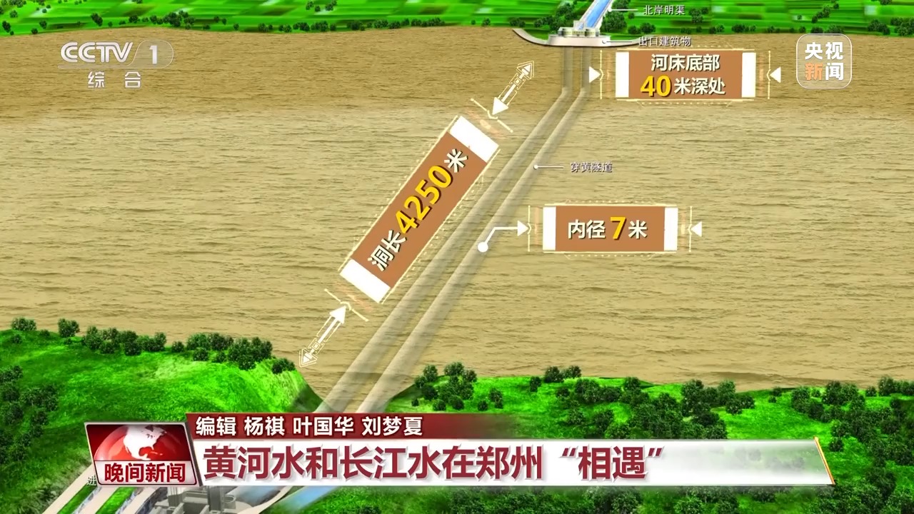 南水北調(diào)工程建設(shè)者在鄭州花園口西黃河河床底部40米深處開(kāi)鑿兩條隧道,穿黃隧道為雙線有壓輸水隧道,單個(gè)洞長(zhǎng)4250米,內(nèi)徑7米,這樣的內(nèi)徑可以滿(mǎn)足洞內(nèi)跑汽車(chē)。有了“穿黃工程”,北上的長(zhǎng)江水通過(guò)兩條穿黃隧道與黃河立體交叉相遇。平時(shí),黃河水在上面流,南水北調(diào)的長(zhǎng)江水在河底隧道中流過(guò),兩者上下而過(guò),猶如一條巨龍?jiān)邳S河之下隱去了身影。