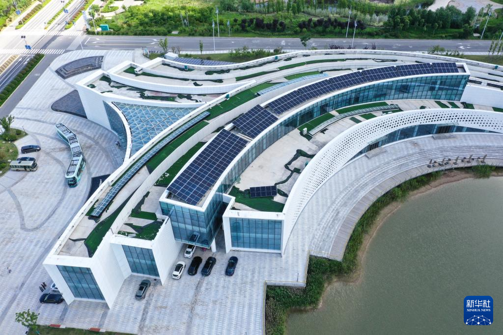 6月6日拍攝的射陽港低(零)碳產(chǎn)業(yè)研究院建筑屋頂使用的太陽能光伏電能系統(tǒng)(無人機(jī)照片)。新華社記者 楊磊 攝
