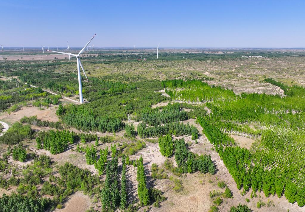 這是在內(nèi)蒙古通遼市科爾沁沙地“雙百萬(wàn)畝”綜合治理工程努古斯臺(tái)項(xiàng)目區(qū)拍攝的風(fēng)力發(fā)電機(jī)組(2024年5月15日攝,無(wú)人機(jī)照片)。新華社記者 連振 攝