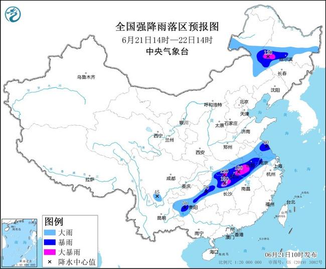 預(yù)計(jì),6月21日14時(shí)至22日14時(shí),貴州中南部、湖南北部、湖北東部和南部、河南東南部、江西西北部、安徽、江蘇以及內(nèi)蒙古東部、黑龍江南部、吉林西北部等地部分地區(qū)有大到暴雨,其中,安徽中部、湖北東部和南部、湖南東北部、內(nèi)蒙古東部、黑龍江西南部、吉林西北部等地局地有大暴雨(100~180毫米)。上述部分地區(qū)伴有短時(shí)強(qiáng)降水(最大小時(shí)降雨量30~50毫米,局地可超過(guò)80毫米),局地有雷暴大風(fēng)等強(qiáng)對(duì)流天氣。