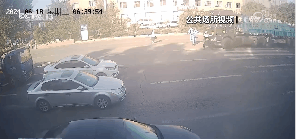 視頻顯示,6月18日早上6點(diǎn)40分左右,輔警陳作兵在長春市第一O六中學(xué)校門前執(zhí)勤。突然,一輛大貨車從遠(yuǎn)處駛來,不斷鳴笛。眼看就要經(jīng)過斑馬線卻沒有及時減速,此時學(xué)生和家長正要過馬路。陳作兵看到后,立即截停車輛,貨車剎車后由于慣性將他撞得連連后退。